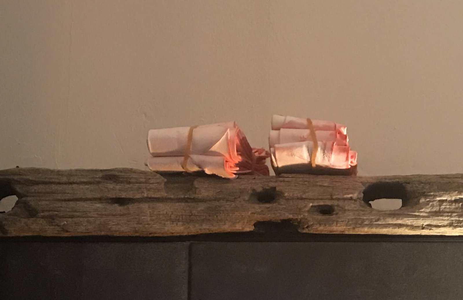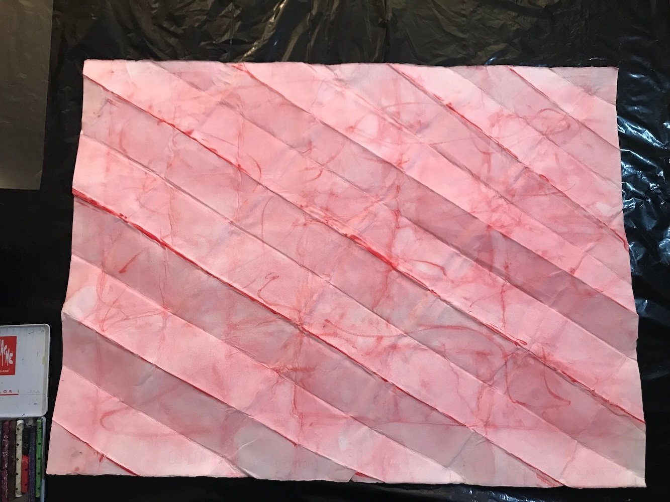 With each subsequent Red Playground set, I’m determined to make the surface of the support even more dramatic than the prior. Accordingly, I soaked the support multiple times to totally soften the paper, followed by staining with Inktense. Then, I accordion-folded and tightly banded the two rolled bundles to dry over our wood-burner.