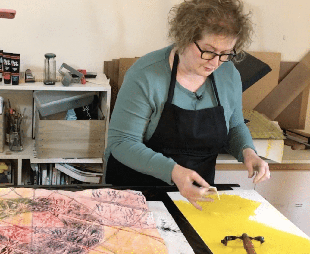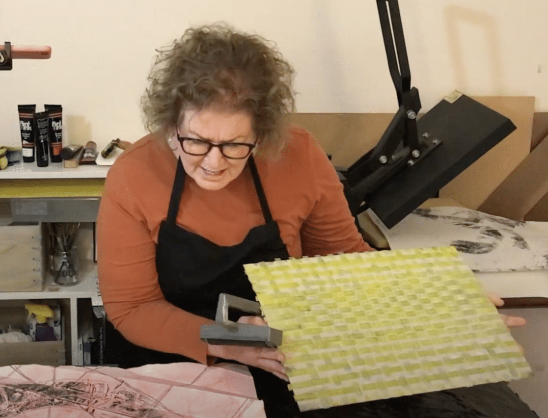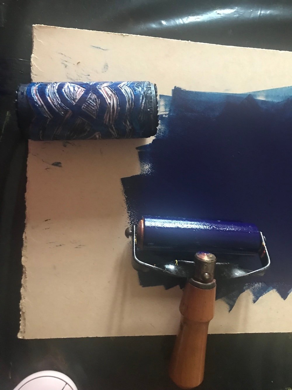 The messiest part came from using strips of canvas to print yellow and blue because I hadn’t properly cleaned one of the printing roller block ends after the workshop. The inked strips served to add complex texture.