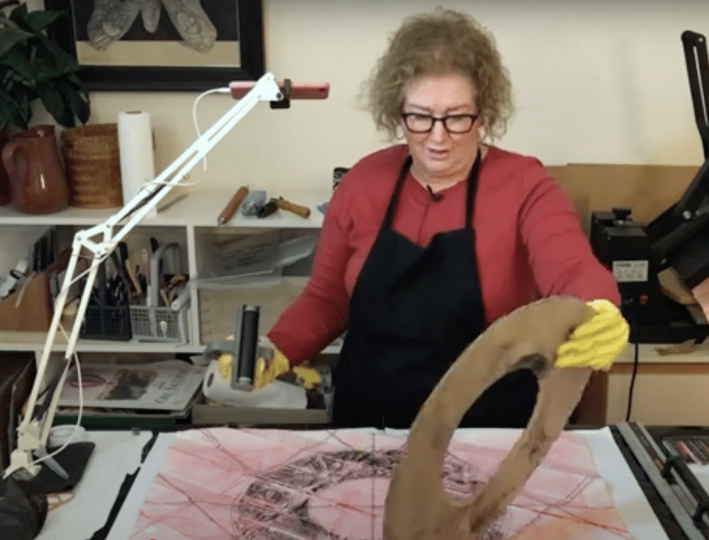 I used printing roller blocks carved at the Sue Cook Workshop to add red and blue oil-based ink.