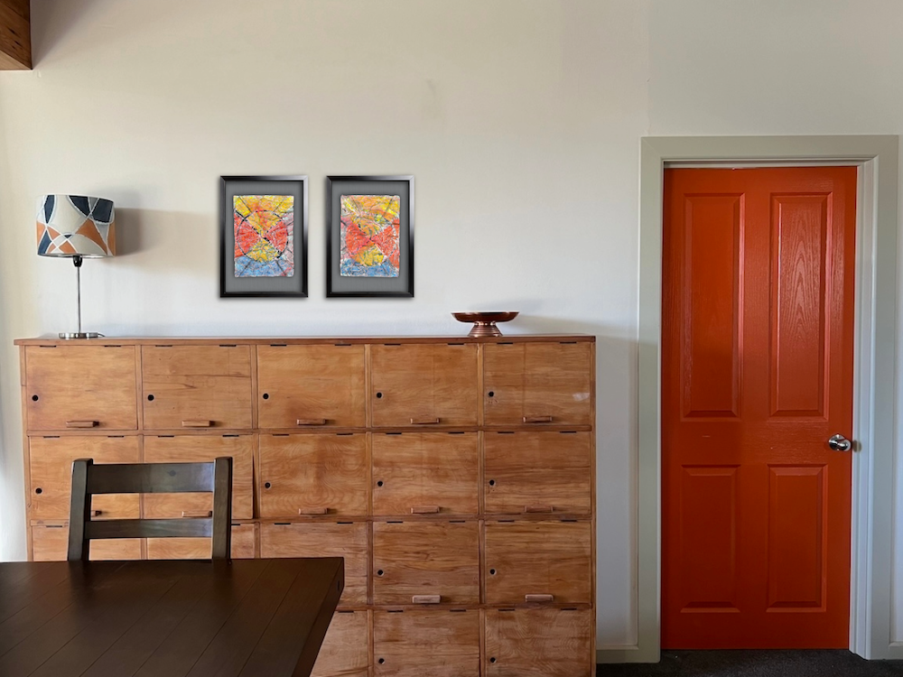 Bright colours and fun shapes bring all the conversation needed. Or, add to chatter yourself, on your own…or with a friend or two! “Yes, Let’s Go” responds to its partner piece “Let’ Whoop it Up!” in a delightful exchange on your walls. It’s also quite conversant on its own. Shown virtually framed and hung in my dining room.