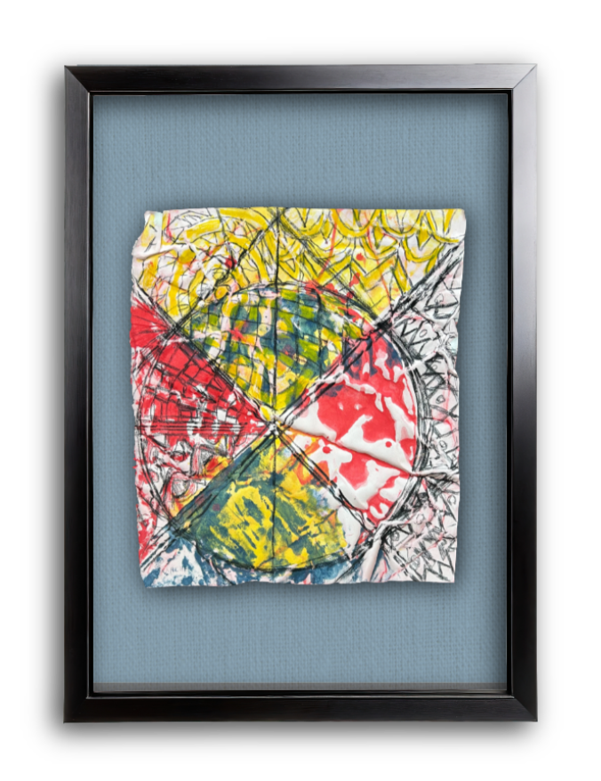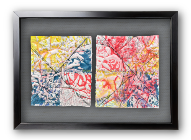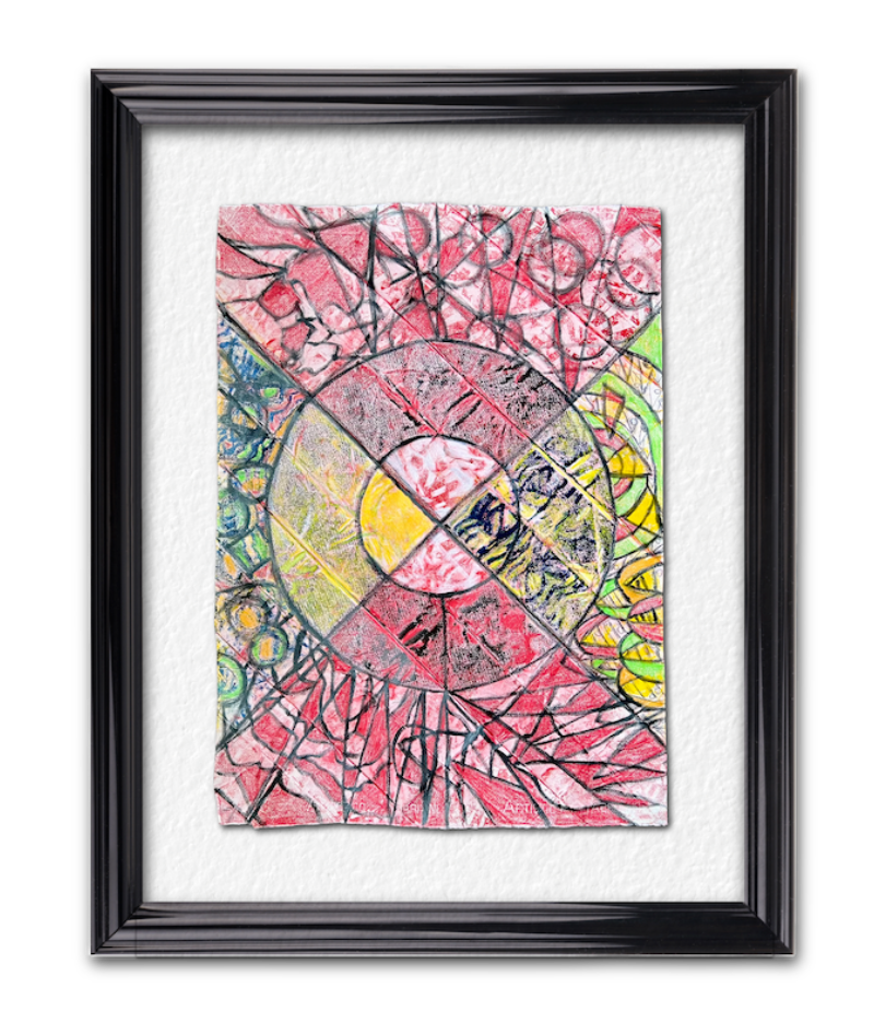 The beginning hand-drawn works were made with Inktense, pigment ink and coloured pencil. Following pieces were mono-printed with Inktense and a bit of oil-stick. Afterwards, works were made by mono-printing with oil-based printing ink.